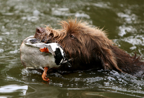Solange der Pudelpointer systematisch und zügig vorwärts strebt, bleibt der Kopf in oder leicht über Rückenhöhe; erst wenn er Lebendwitterung findet, verlangsamt er Tempo und Rutenbewegung, und weist mit dem hochgereckten Kopf in Richtung des Vogels, den er nun fest vorsteht. Macht sich das Wild zu Fuss davon, zieht der PP instinktiv und vorsichtig nach, bis er erneut in Vorstehpose verharren kann. Es ist sicher erwähnenswert, dass dieser Hund, so man ihn nur entsprechend ausbildet und ihm die nötigen praktischen Erfahrungen verschafft, ohne weiteres in der Lage ist, in Anpassung ans Gelände und zu jagende Wild, sehr ausholend oder umgekehrt unter der Flinte zu suchen. Dass die Rasse auf Grund ihrer stark ausgeprägten Wasserpassion bei der Jagd am und im Wasser brilliert und ausgezeichnet apportiert, versteht sich. Im Wald kann der PP sowohl als lauter Stöberer vor dem Schuss als auch nach dem Schuss auf der Schweissfährte eingesetzt werden. |