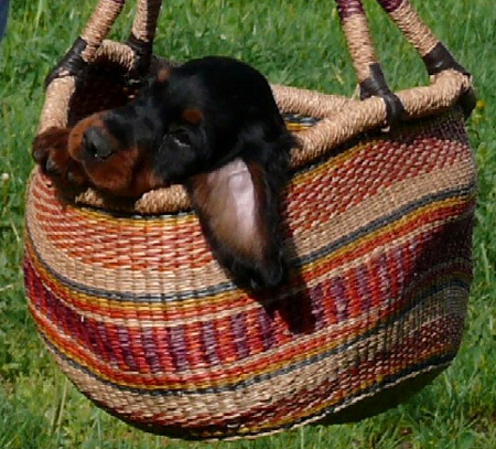Ich hatte irgendwann die Idee: Der Gordon Setter ist mein Leben, und ich möchte, wenn ich die passende Hündin finde, mit ihr züchten. Es war aber nicht leicht, diese passende Hündin zu bekommen. Es sollte fast 6 Jahre dauern... Ich fuhr zu Ausstellungen, sah mir die Hunde an. Und ich wurde immer öfter auf einen bestimmten Zwinger aufmerksam. Aber so richtig wusste ich noch nicht... ich war einfach noch nicht so ganz sicher. Mein Mann machte meiner Unsicherheit schliesslich ein Ende und setzte mich an meinem Geburtstag ins Auto. Wir fuhren zu einer mir sehr gut bekannten Züchterin. Die setzte mir ein schwarzes Bündel in den Arm und meinte: " Die Maus gehört dir." So zog Duffy bei uns ein. Eine Hündin. Uiii, können die kommpliziert sein..! Als Duffne ein Jahr alt war begann ich mit ihrer Ausbildung. Sie war zwar leichter zu führen als Yeti, aber was den Apport anging... Na ja, typisch weiblich eben: nein, das mag ich nicht, das mach ich nicht. Das Problem, das wir Nicht-Jäger haben, ist, dass wir unsere Hunde zwar trainieren aber nicht führen können. Schweren Herzens gab ich Duffne zu einem Ausbilder. |