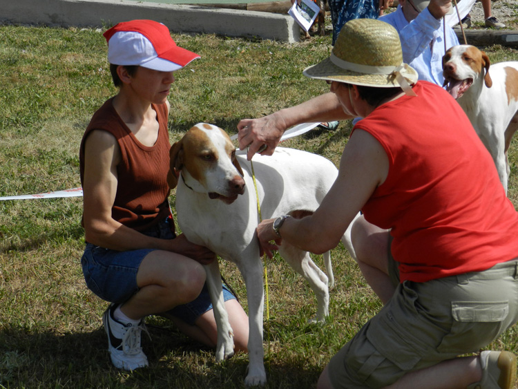Zuerst war am Samstag also die National d'Elevage – die Zuchtschau. Die ist in Frankreich eher ein Familienfest, ganz locker und ungezwungen. Die Klassen reichen von Baby bis Superveteran. Im Gegensatz zu deutschen Gepflogenheiten werden allerdings in einem separaten, kleinen Ring zunächst bei allen Hunden die Zähne kontrolliert und die Größe gemessen. Gerichtet wurde von Michel Bonn, einem alten Experten. In Frankreich müssen die Zuchtrichter für Vorsteher übrigens auch Jagd richten können und umgekehrt. Monsieur Bonn nahm sich viel Zeit für jeden einzelnen Hund, der eher ruhig im Schritt neben dem Führer vorgeführt werden sollte. In Deutschland werden die Hunde stattdessen ja vorgetrabt (was eigentlich kontraproduktiv ist, schließlich soll die BSG ein Galoppierer sein und nicht traben). Die Klassen kamen ziemlich durcheinander an die Reihe; welche Klasse gerade komplett war, war dann auch dran. Eltern nahmen ihre Kinder mit in den Ring bzw. ließen die Hunde von ihnen vorführen während sie selbst hinterher gingen. Alles kein Problem – wie gesagt, man liebt es ungezwungen und familiär. Stolz waren wir natürlich, dass in einer stark besetzten Zwischenklasse unsere kleine „deutsche“ BSG mit Excellent 3 bewertet wurde, denn das heisst für uns, dass wir in Deutschland doch sehr gut im Standard der Franzosen liegen. |