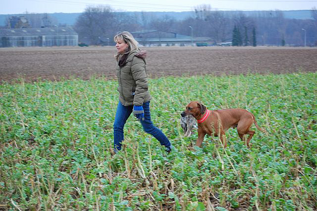 Frauchen machte von Anfang an den alltäglichen Appell und die Hundeschule, und ich muß ihr eingestehen, dass sie das mit Bravour meisterte… Die ersten kurzen Gänge ins Revier machte Cooper mit mir ab dem 3. Monat. Ab dem 6. Monat schlossen wir uns der Rhodesian Ridgeback Arbeitsgemeinschaft Jagdhund ( RRAG-Jagdhund.de) an. Dort lernten wir Gleichgesinnte kennen, zu denen sich schnell Freunschaften bildeten. Ca. 100 Rhodesian Ridgebacks werden in Deutschland jagdlich geführt, und das Steckenpferd ist die Ausbildung auf der Schweißfährte. So sollte es auch bei uns sein, und nun begann die Fleißarbeit. |